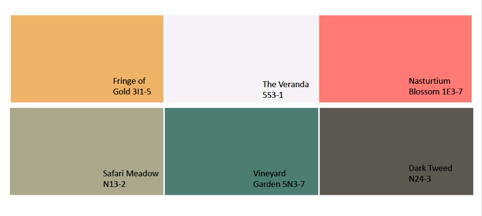 Tomando en cuenta lo dicho en el punto anterior, no es sorpresa que el verde sea un color muy de moda en este 2022. Por eso elegimos dos tonalidades de verde en nuestra paleta: Safari Meadow y Vineyard Garden. Combínalo con colores llenos de optimismo y alegría como Fringe of Gold o Nasturtium Blossom y ya tienes la receta perfecta para un año transformador.