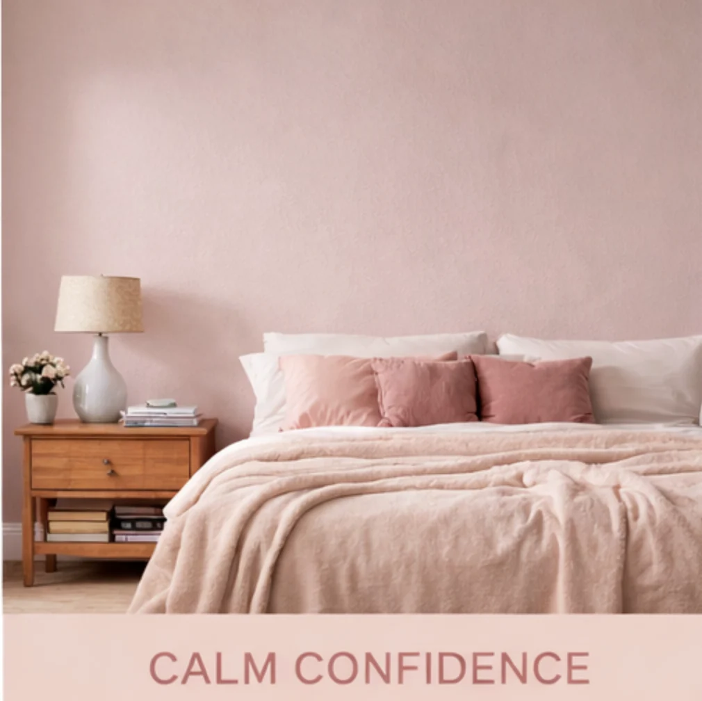 Calm Confidence tiene ese toque rosado suave que relaja sin volverse “empalagoso”. Es muy fácil de vivir y hace que las habitaciones se sientan acogedoras.