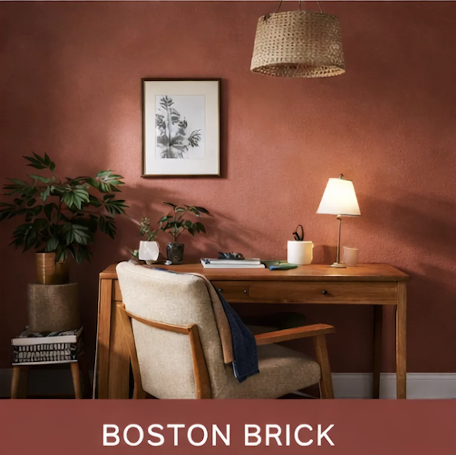 Boston Brick trae ese toque terracota que da nostalgia y calidez. Funciona en pequeñas dosis y crea esa intangible sensación de hogar.