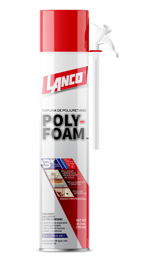 Poly-FoamTM es una espuma de poliuretano en aerosol autoexpandible y monocomponente, de curado por humedad. Está diseñada para facilitar la dispensación manualmente a través de una cánula incluida con cada bote. No contiene ningún gas propulsor perjudicial para la capa de ozono.