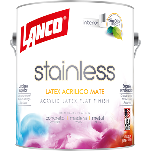 Stainless pintura acrílica de excelente calidad, bajo olor y bajo C.O.V. (compuestos orgánicos volátiles) para todo uso. Garantiza cobertura con una sola aplicación sobre cualquier color o superficie. Es ideal para ser usada en interior o en lugares donde se requiera una pintura 100% libre de olores. Se recomienda para ser usada en cocinas, baños y cuartos de juegos.